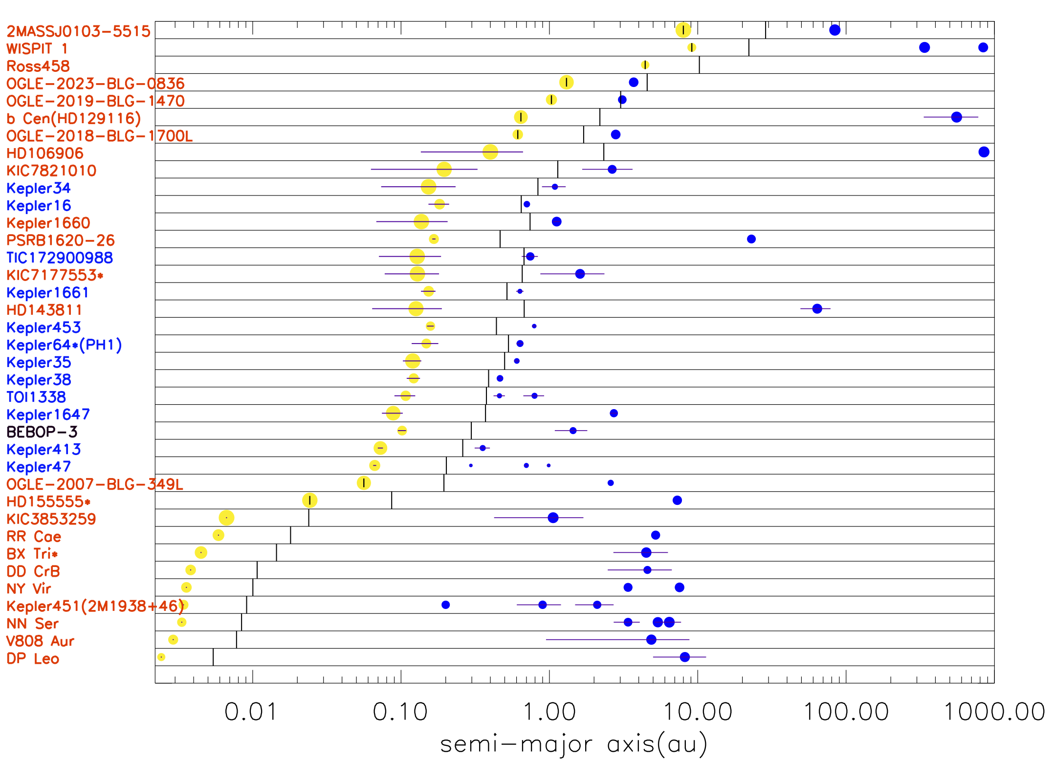 Figure 1: Architecture of confirmed binary systems harboring a confirmed exoplanet on a P-type orbit, that is, a planet orbiting both stars. Note that we plot here, for both the companion star and the planet(s), the semi-major axis centered on the binary's center of mass. The blue circles' location shows the semi-major axis of the exoplanet while the yellow circles show the location of the companion star. The radius of the blue circle is proportional to the estimated radius of the planet (or the cubic root of its mass when only a mass estimate is available). The radius of the yellow circle is proportional to the cubic root of the mass ratio between the companion and the central star (for the sake of visibility, the sizes of the planets have been inflated by a factor 20 with respect to the sizes of the yellow stars).